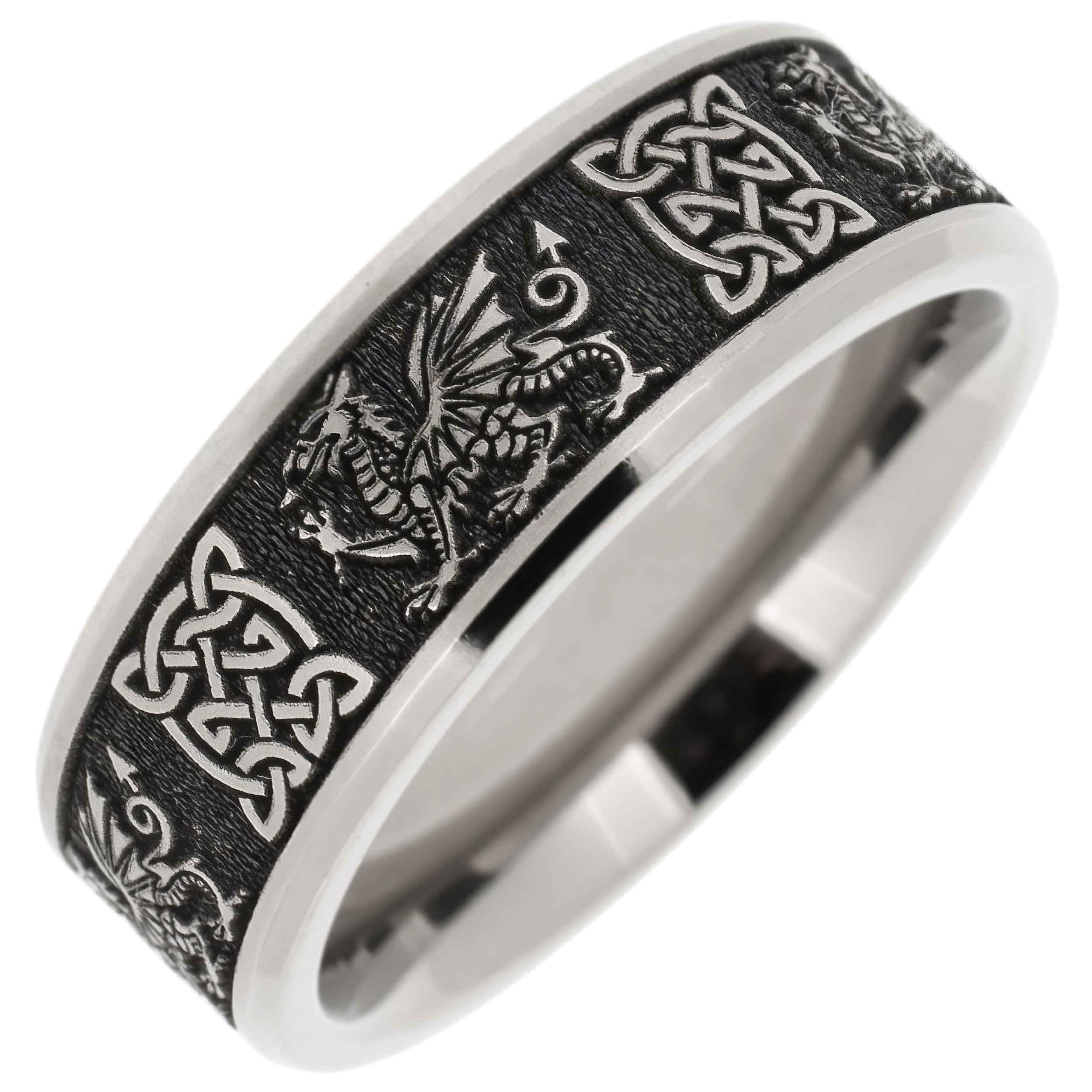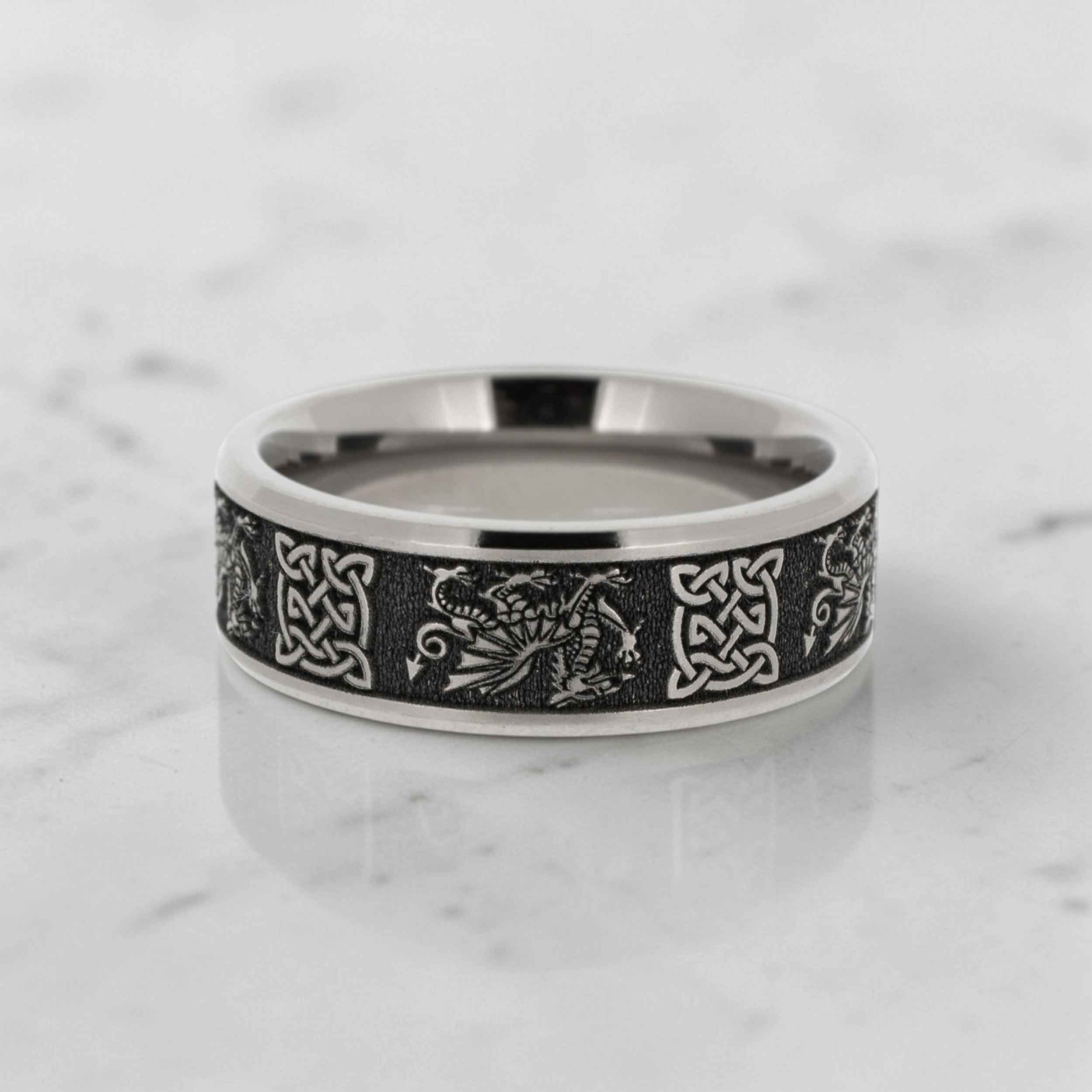 Unique Welsh Dragon Titanium ring with a polished finish and bevelled edges. This titanium wedding ring also boasts a comfort fit. This titanium ring is custom made and will take 4 weeks until delivery.