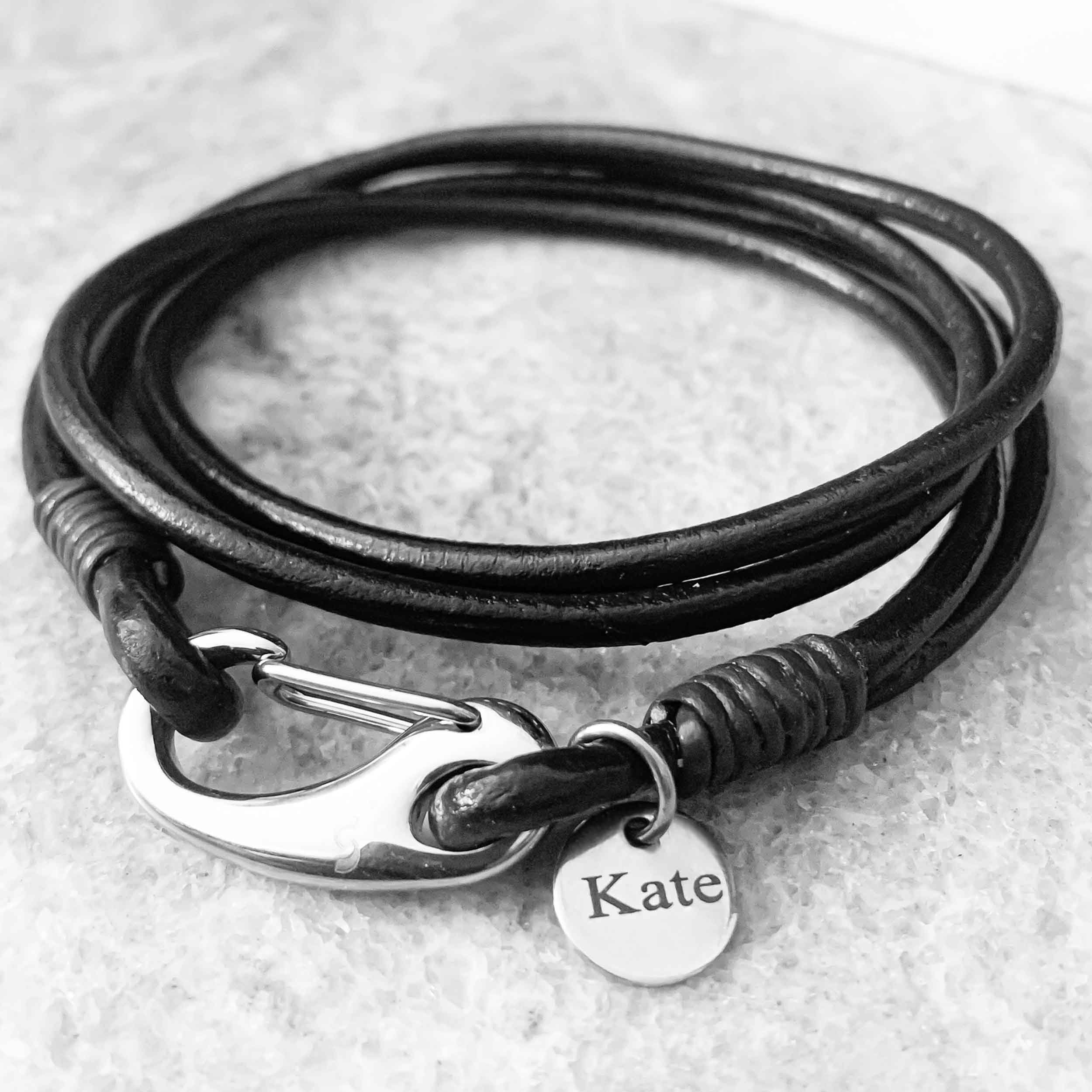 Best selling splendid leather bracelet with two black straps which wrap around the wrist to lock with a high polished Stainless Steel lobster clasp. Dimensions 3mm. Stack it with similar designs or wear yours solo for maximum effect. Personalise this popular bracelet with a subtle stainless steel high polished disc with a name and date of birth, dimensions 9mm. Please note there is a maximum of 6 characters front and back.