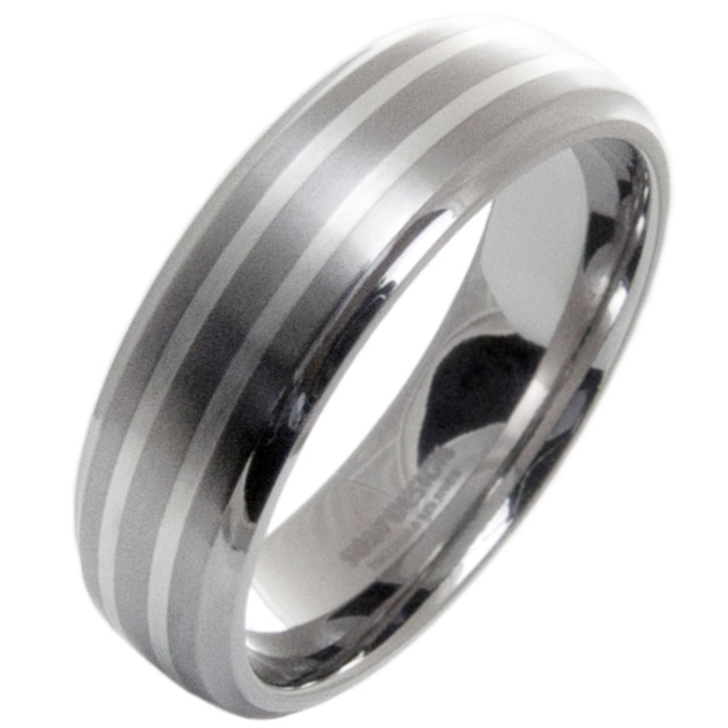 Flat profile Titanium ring with high polished shoulders and two contrasting and stunning satin finished Silver inlays. Width 7mm. This ultra-strong, durable yet light metal is a true marvel, corrosion resistant and was discovered in the UK. Perfect for those who demand versatile durability and modern style all in one. Crafted from brushed and polished titanium on a flat profile band with two silver inlays.