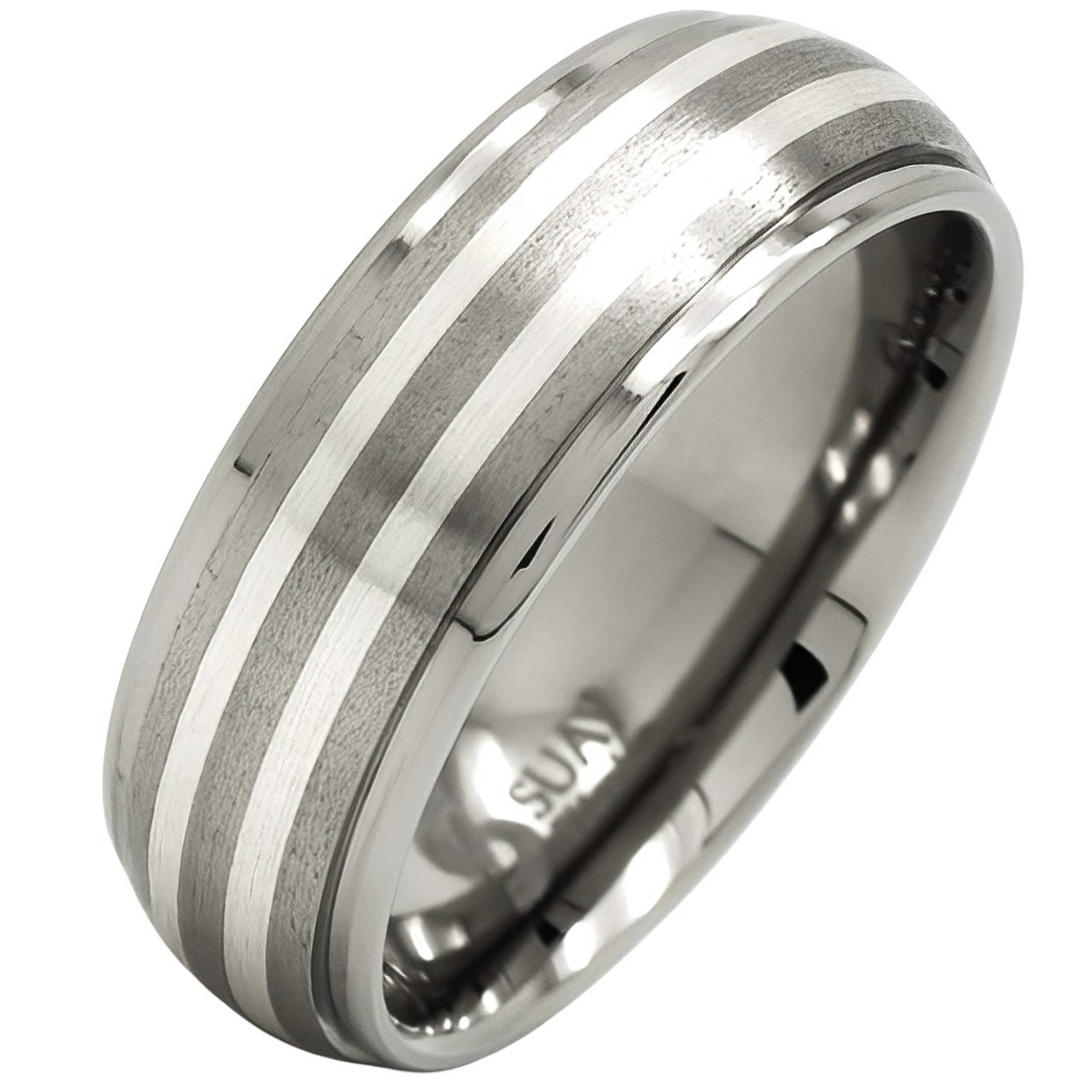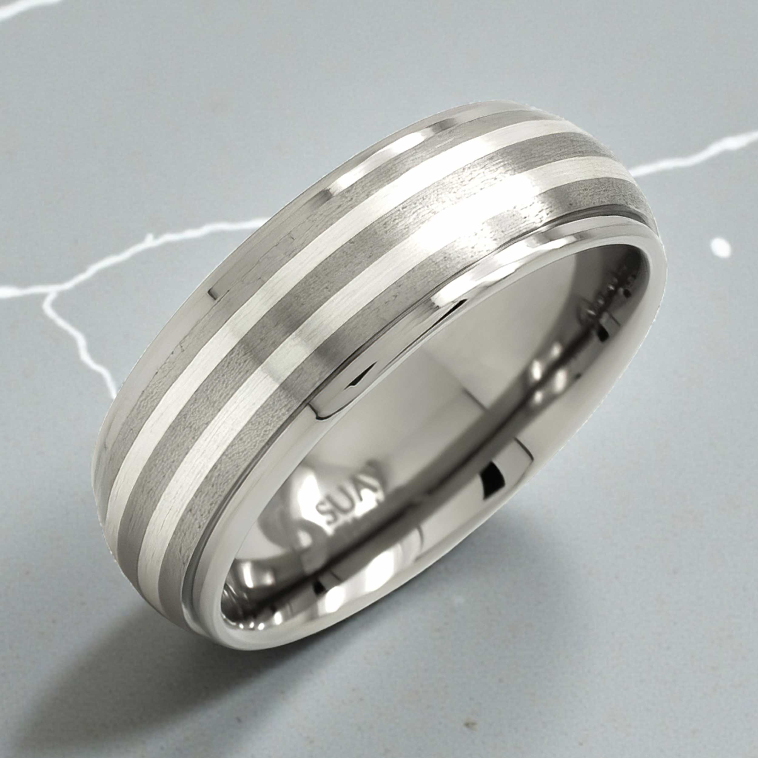 Eye catching dome profile titanium ring with two silver inlays running through the centre. With highly polished shoulders and a satin centre this handsome ring is ideal for your special occasion. Width 8mm.