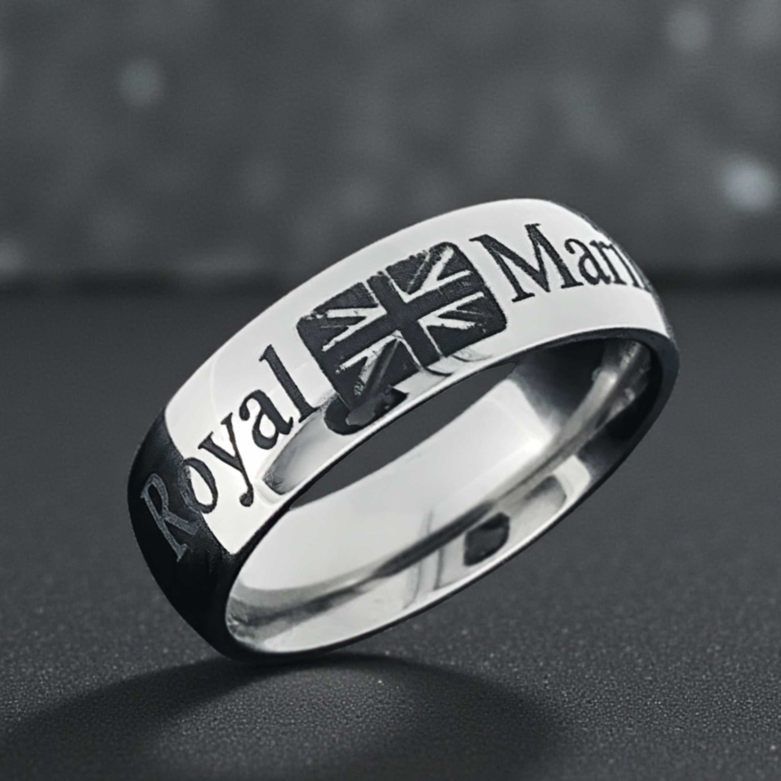 Superb high polished titanium ring with an engraved Union Flag and Royal Marines motif. Width 6mm or 8mm. Please note that this customised ring is non refundable and non exchangeable.