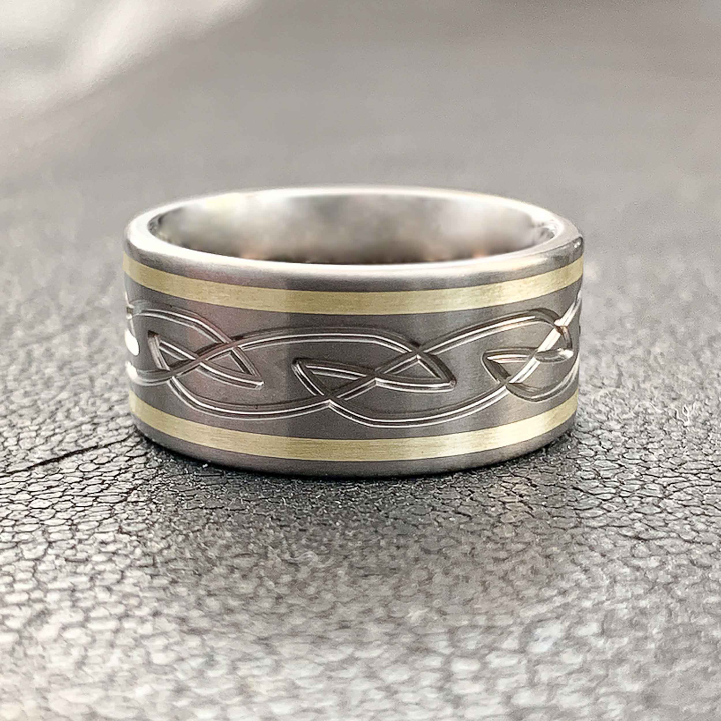 Make a statement with this ultra wide titanium celtic ring with twin 9kt gold inlays in a satin finish. Symbolic of eternal love and loyalty and a stunning and visible acknowledgement of your commitment to each other. Manufactured in under 4 weeks.