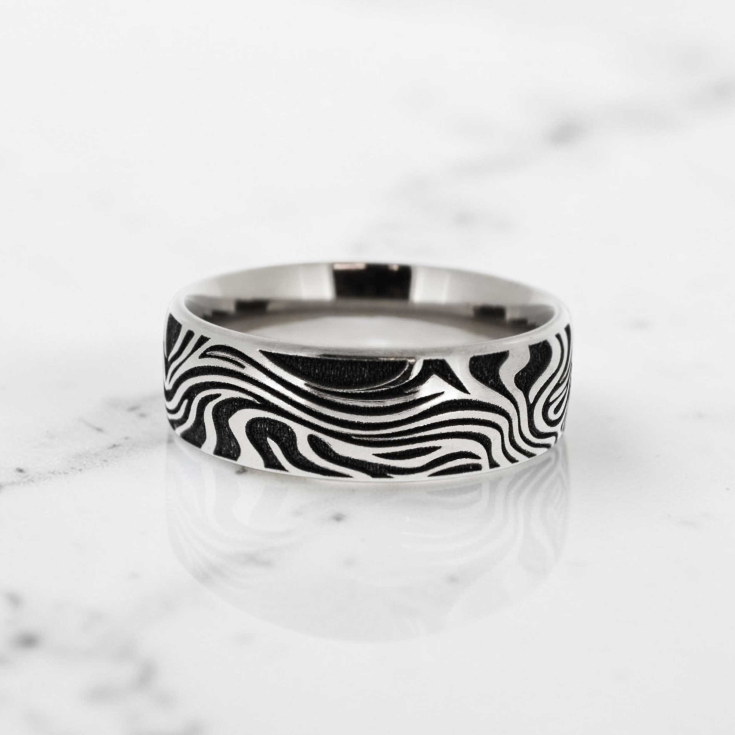 Damascus‑style titanium flat profile ring with a pattern reminiscent of natural wood grain. This striking polished finish ring is perfect for those wanting to stand out from the crowd. Custom made in the UK in around 4 weeks, tester rings will be sent first.