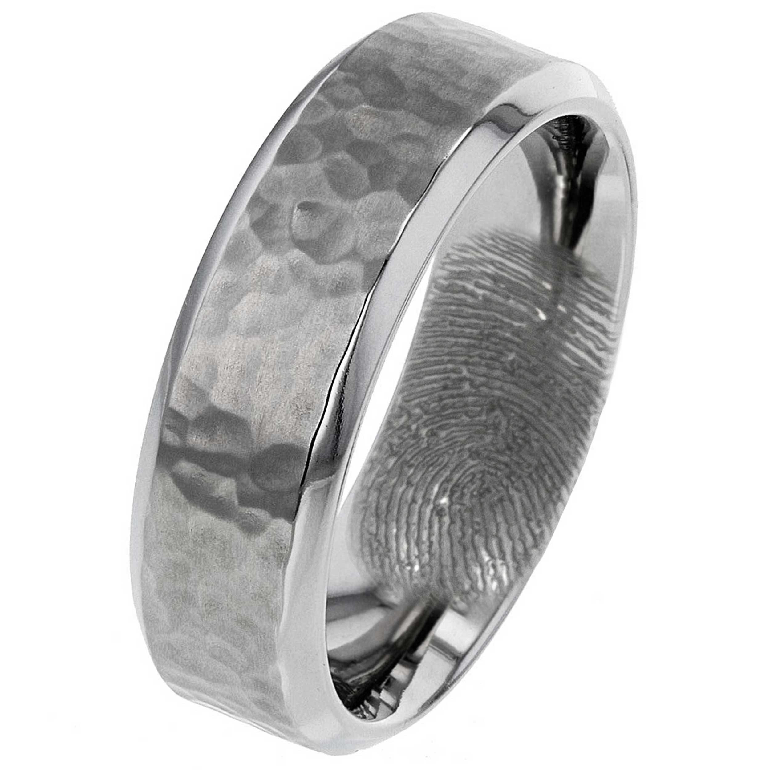 Fantastic titanium ring with a hammered finish and a flat profile and personalised secret fingerprint inside, along with polished bevelled shoulders. Custom made in the Uk in 4 weeks.