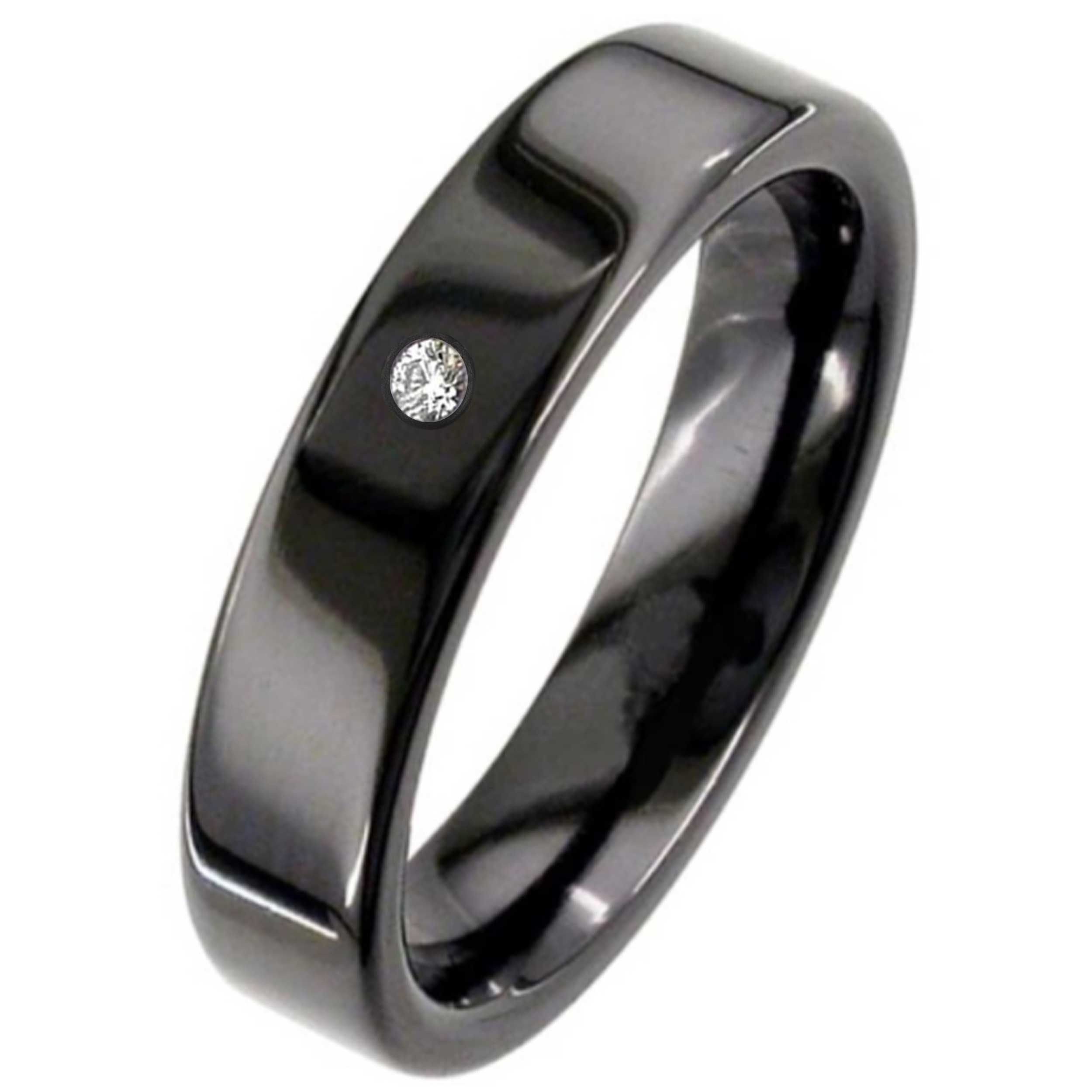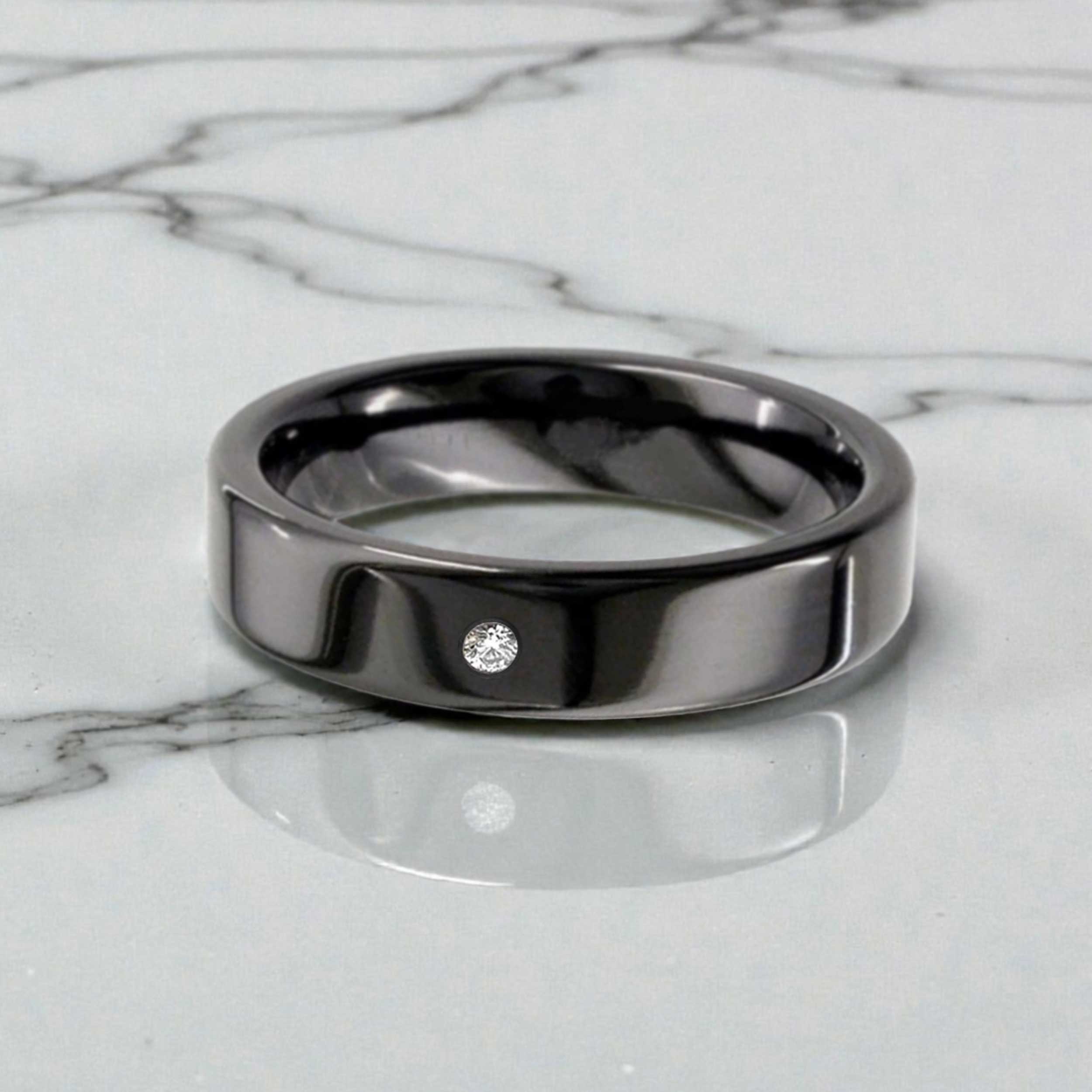 Polished black Zirconium ring with a flat profile and a stunning three point-diamond. An exceptional ring and a more unusual option for a wedding ring, crafted in 3 weeks. Larger widths are available in this Zirconium Ring, please contact us for details.