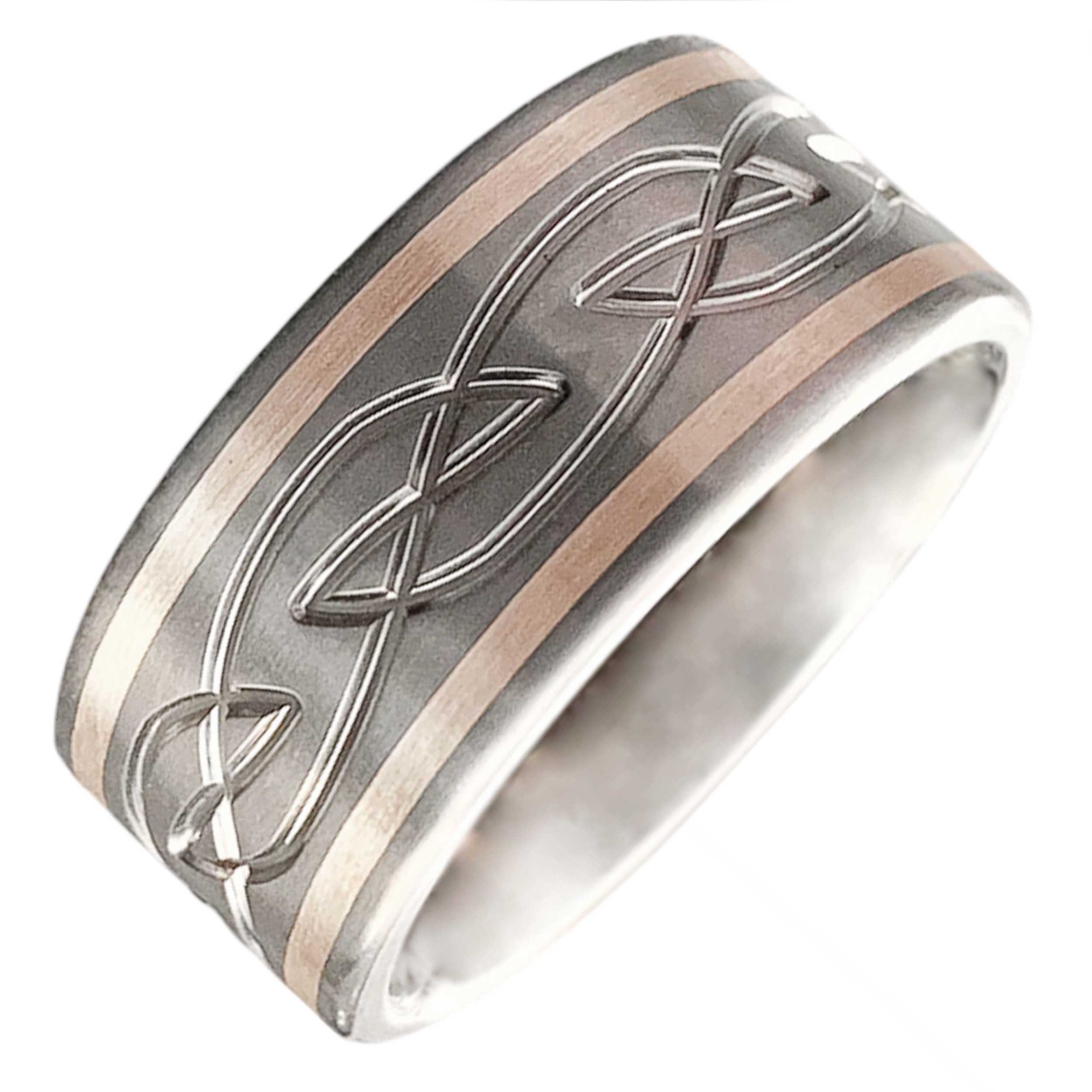 Eye catching wide Titanium ring with a celtic pattern emerging between stunning rose gold inlays. This satin finished titanium ring is ultra wide for those of us who crave a little attention, manufactured in 3-4 weeks.